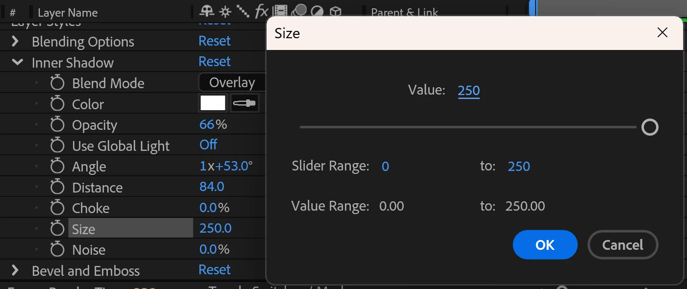 Was following a project tutorial, and in the video, the creator sets an inner shadow size to 450, however mine caps at just 250.