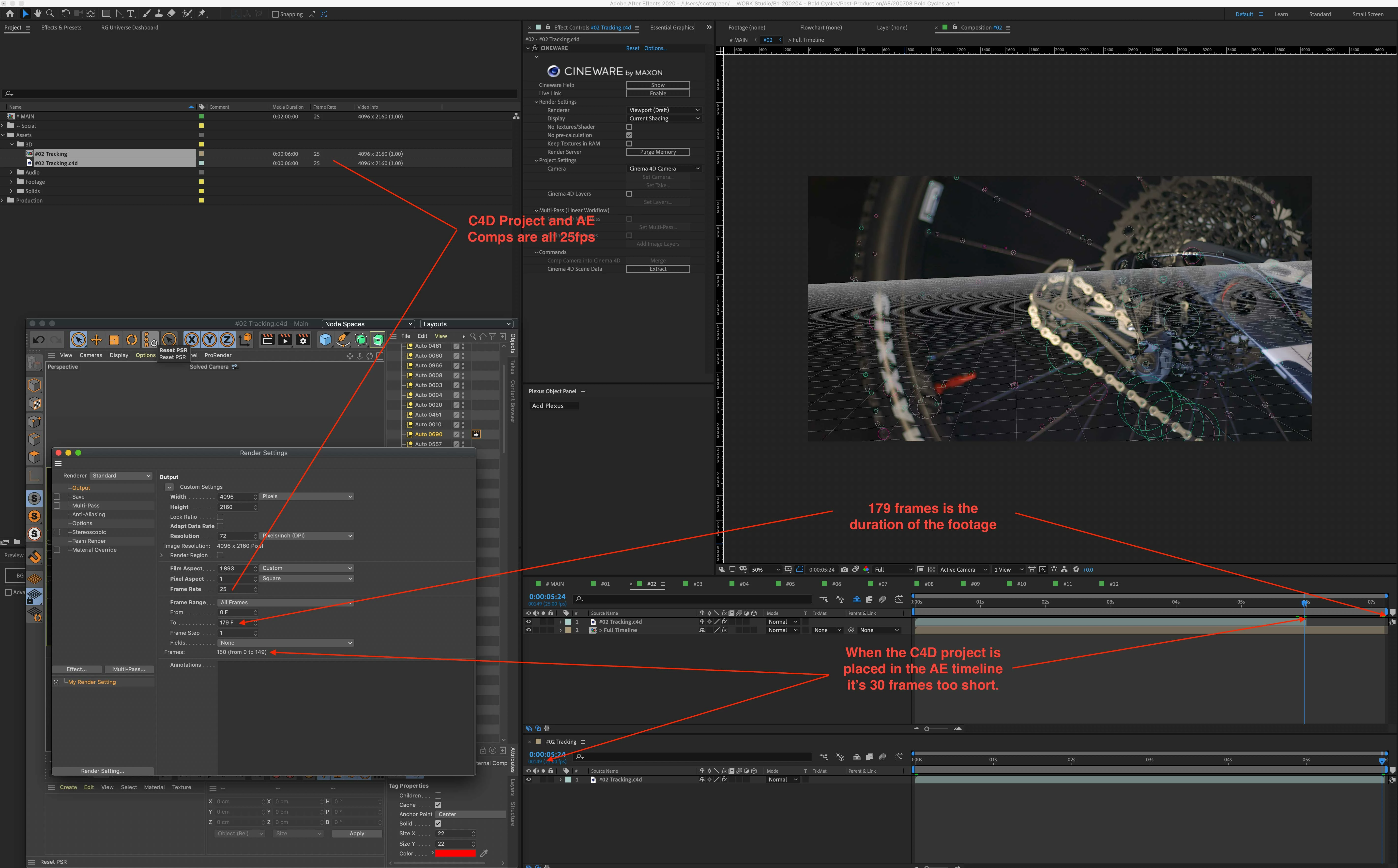 I have Cinema 4D Lite. I have a model of a iPhone in C4D that has an animation of 168 frames. When placed into a sequence in After Effects (sequence is set to be longer than 168 frames) the C4D sequence is only 3 seconds long (or 90 frames). I have changed the render and project settings in Cinema 4D to be 168f as well as well beyond that (below is 168f) but still have this issue. I have tried multiple machines and clean installed the programs yet the problem persist. I really appreciate any help. I this is my first project so I might be missing something small.