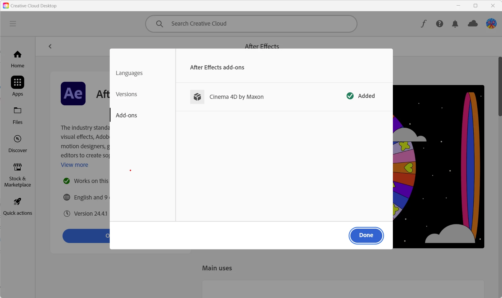 I'm on Creative Cloud 24 and I can't stop Cinema 4D from installing whenever After Effects is updated. Cinema 4D by Maxon is checked as Added in the Add-ons tab and I there is no way to uncheck it. I just updated to AE version 24.4.1 and, of course, Cinema 4D installed. I use Blender and do NOT WANT TO INSTALL Cinema 4D every time After Effects updates. Initially, I had Cinema 4D not selected in the Add-ons, but somehow it changed to Added somewhere along the way.