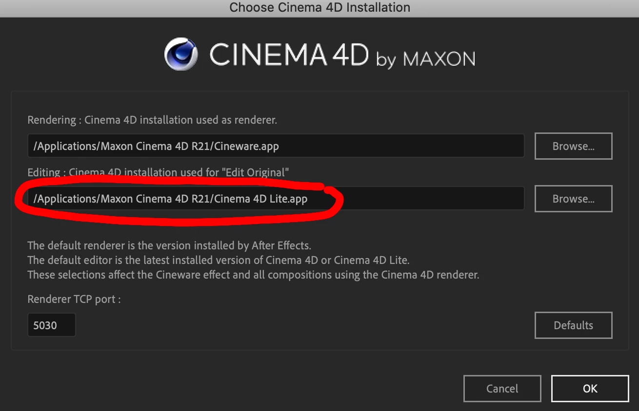 So then I've tried installing C4D Lite through the options tab of the Cineware effect on Ae but there doesn't seem to be a C4D lite App in the Maxon Cinema 4D R21 folder downloaded from Maxon website to link to... Pics attached from adobe forum as to how to do this and I've circled the link I'm missing in red.