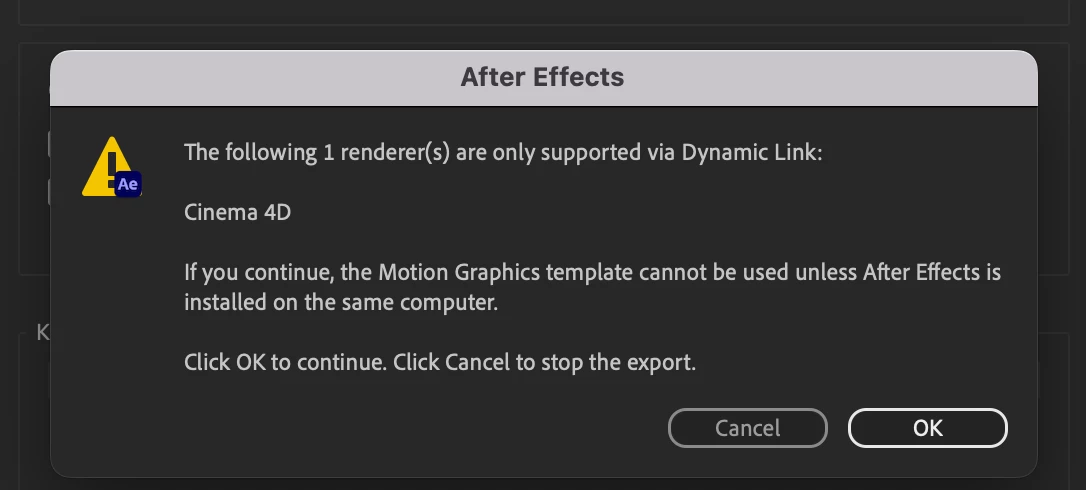 While exporting a mogrt template a pop-up message I'd never seen before came up (see attachments). Basically, the person receiving the template I made needs to have After Effects installed in order to use it, or the mogrt won't work.