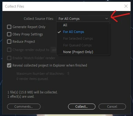 However, since this update (at least I think), the "Collect files" features in AE doesn't work anymore for me. So if I click on it and select the destination folder, I'll have the AE in this folder, as usual... but no "(Footage)" folder. At first I thought it might be hidden, but it's not. If I open the AE and reveal in Finder one of the assets, it's still in its "old" folder.