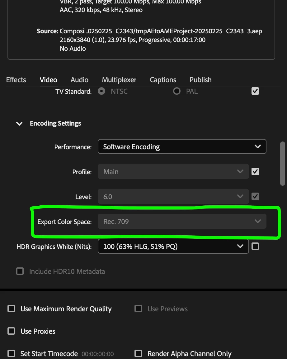 Color Differences between Adobe After Effects and AME; Rec709 Option is Greyed Out