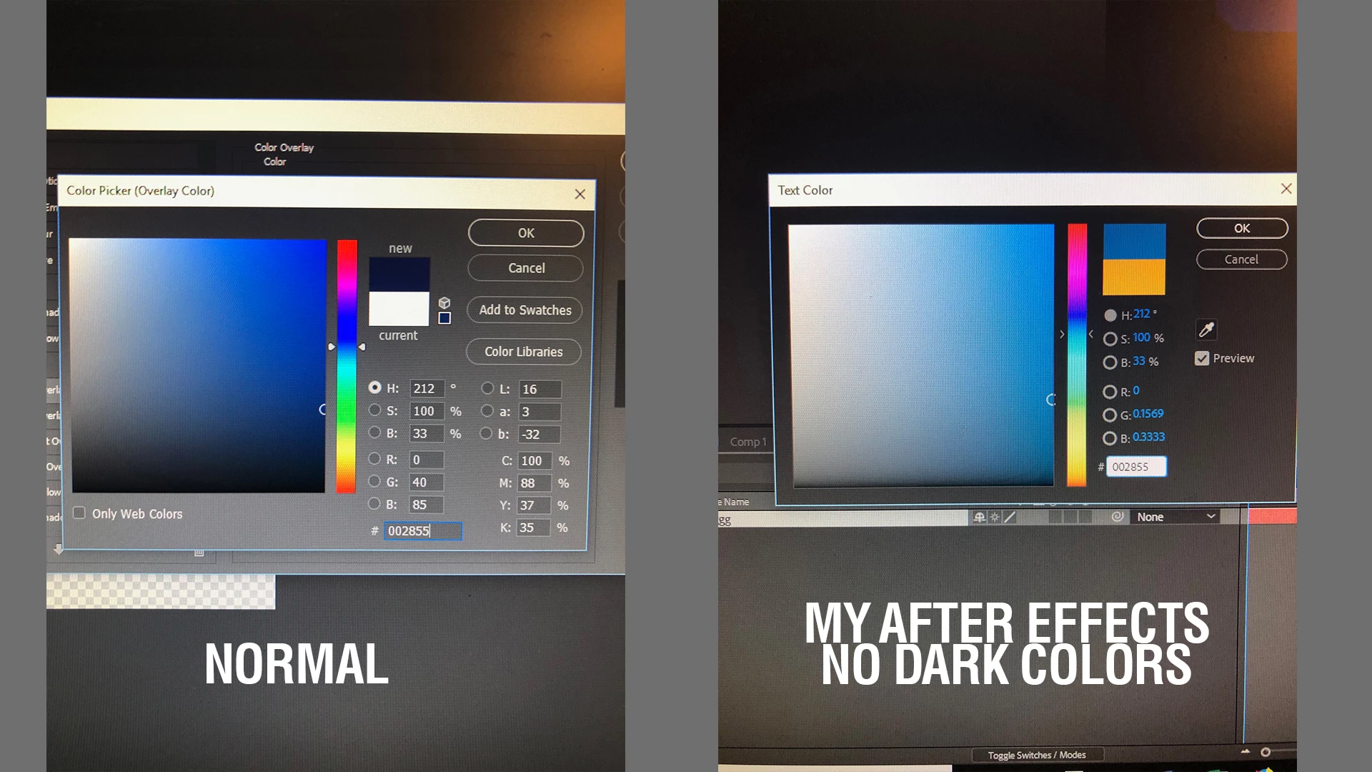 On the right, my color picker in After effects CC 2017, the color picker is very light in nature. Same Hex Code. I have no idea how it defaulted to that or how to change it back.