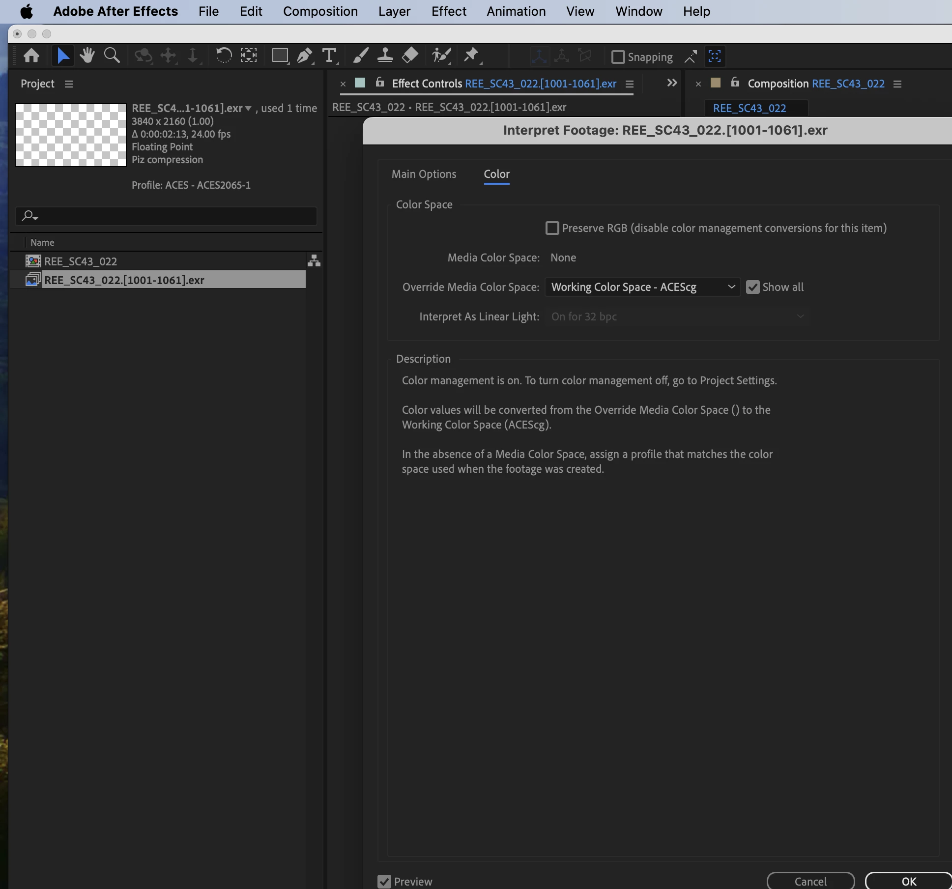 This has caught me out a couple of times this job. Imported frame sequences are set to ACES2065-1 but somehow switch to the working color space (ACEScg). Haven't tracked close enough to see what circumstances cause this.