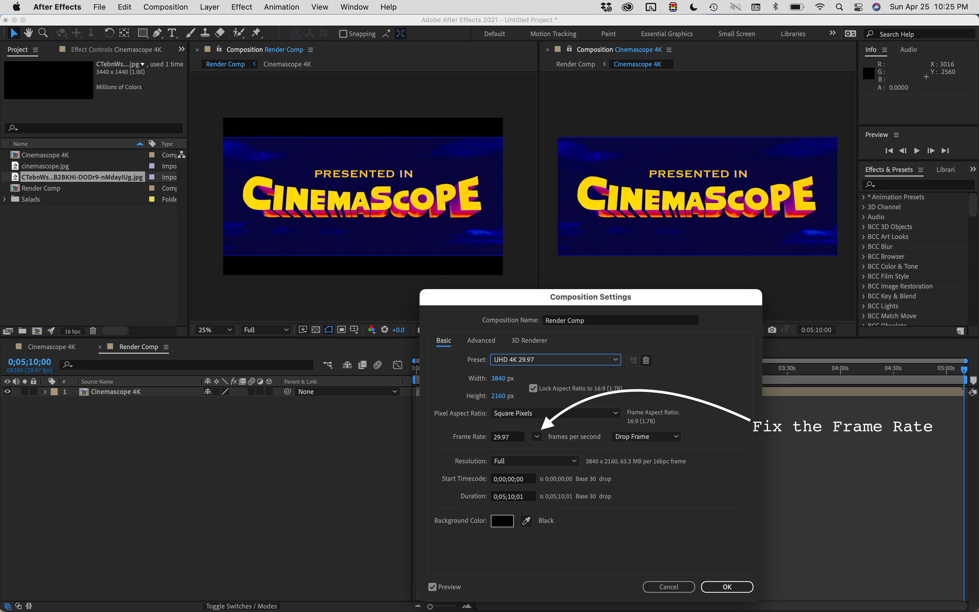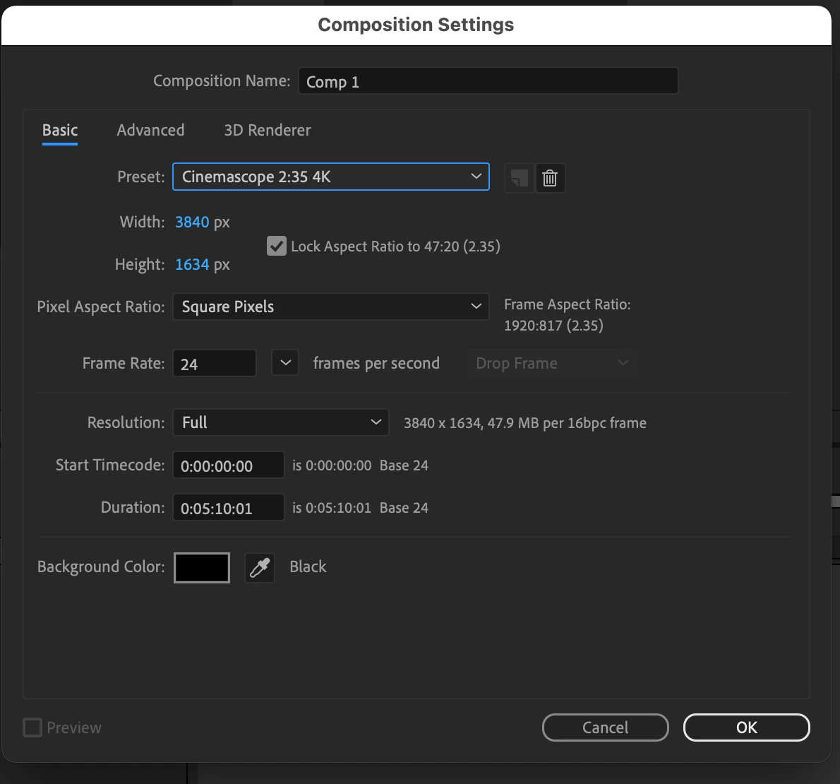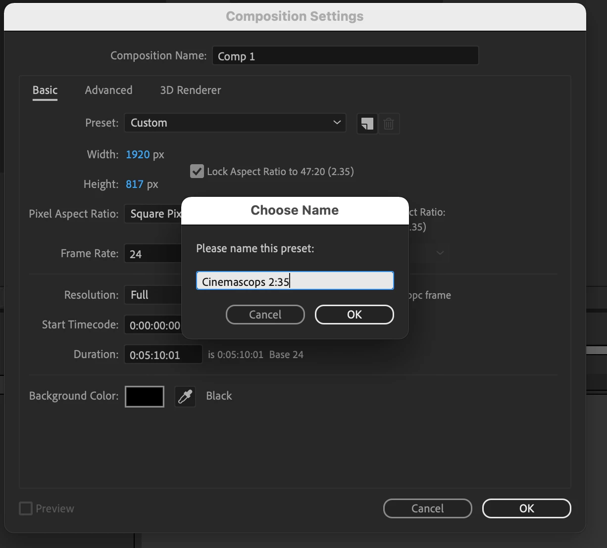 You are almost done. You have created both an HD and a 4K Cinemascope preset. These are useful for creating your compositions, but not so useful for rendering. In almost every case, if you are rendering from After Effects for distribution, you need to put your comp in a standard HD or 4K comp for rendering. If you are creating a production master that will be re-rendered for distribution you don't need to bother, but for anything else, you are better off rendering your Cinemascope project in a standard frame size comp.