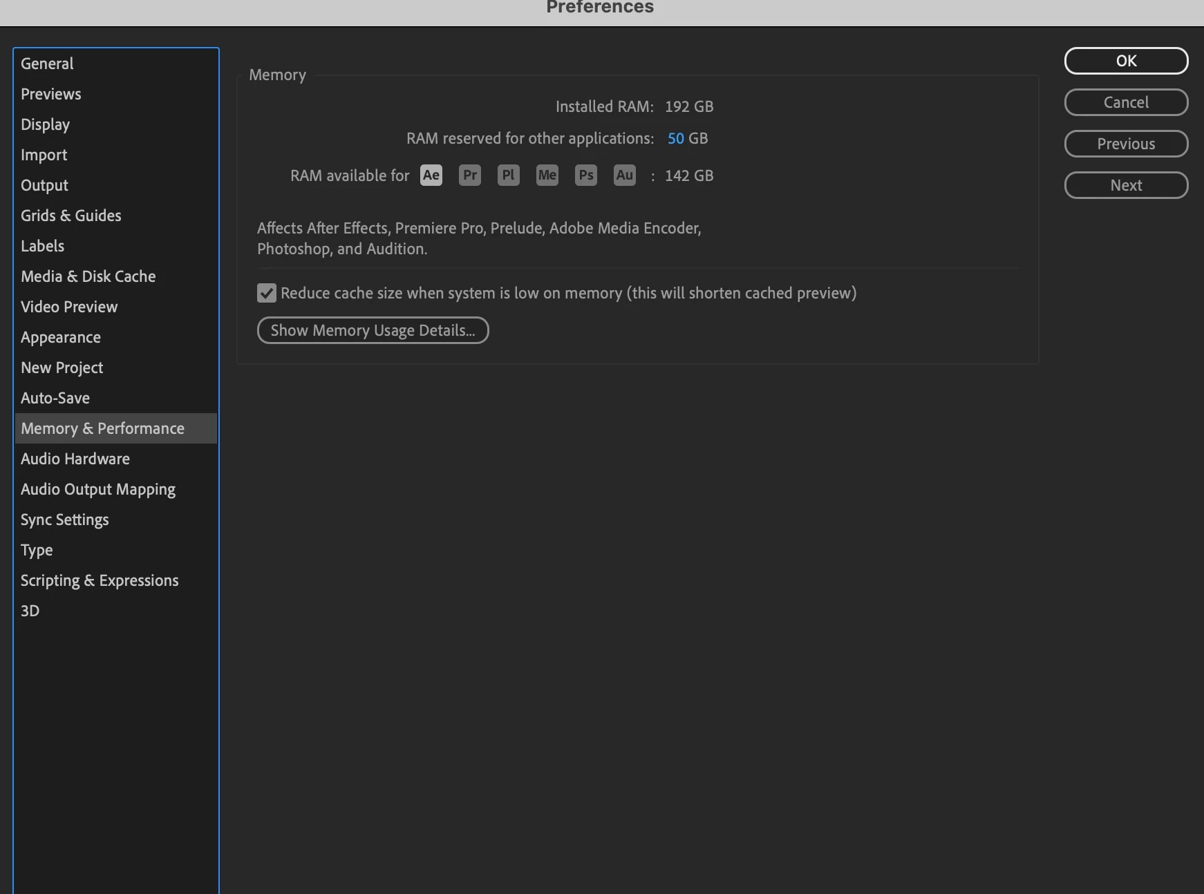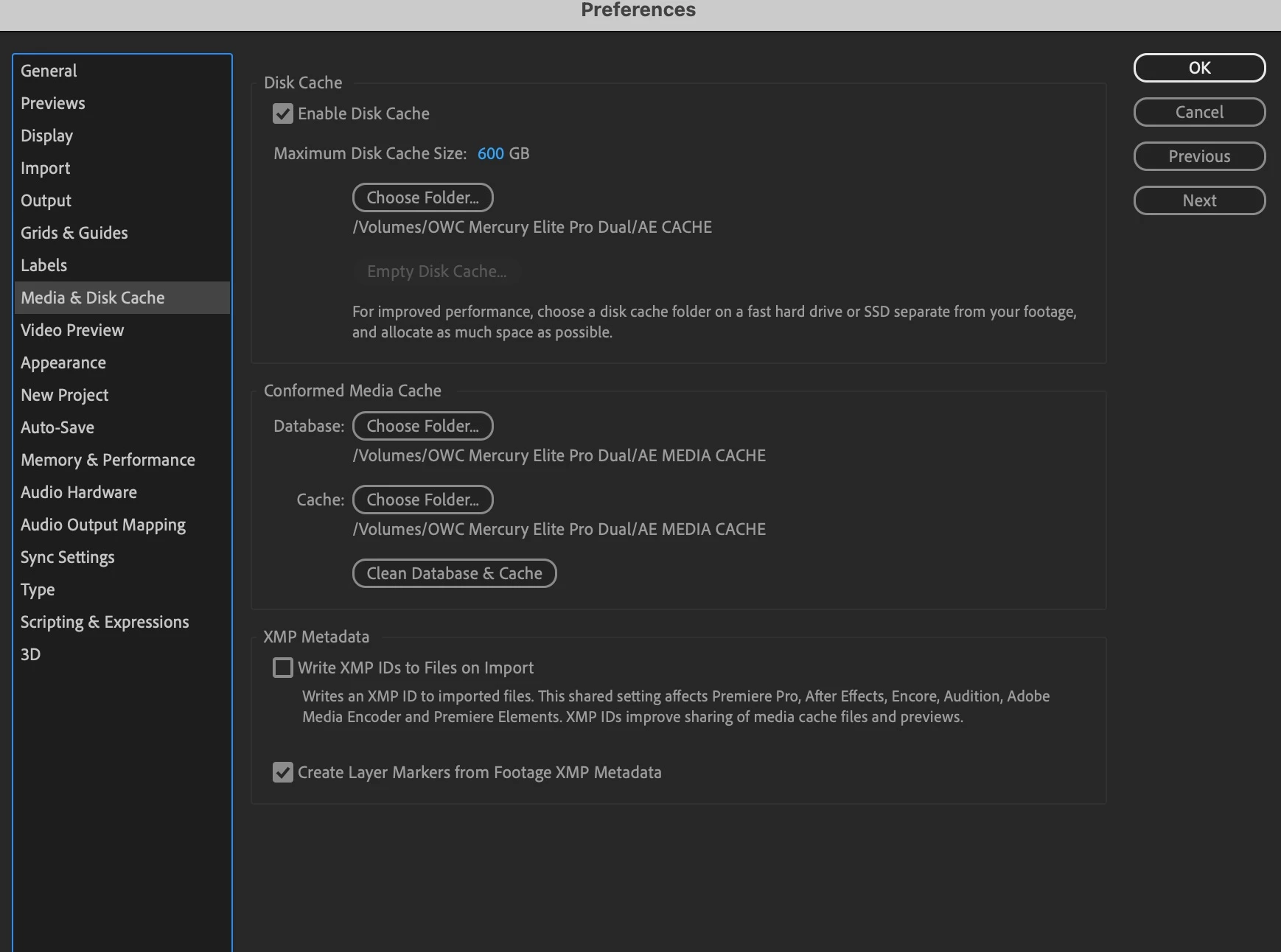 Drives: 2TB Internal Flash Drive where App and mdia cache lives; OWC Mercury Elite Pro Hardware RAID 0 USB 3.2 gen 1 4TB