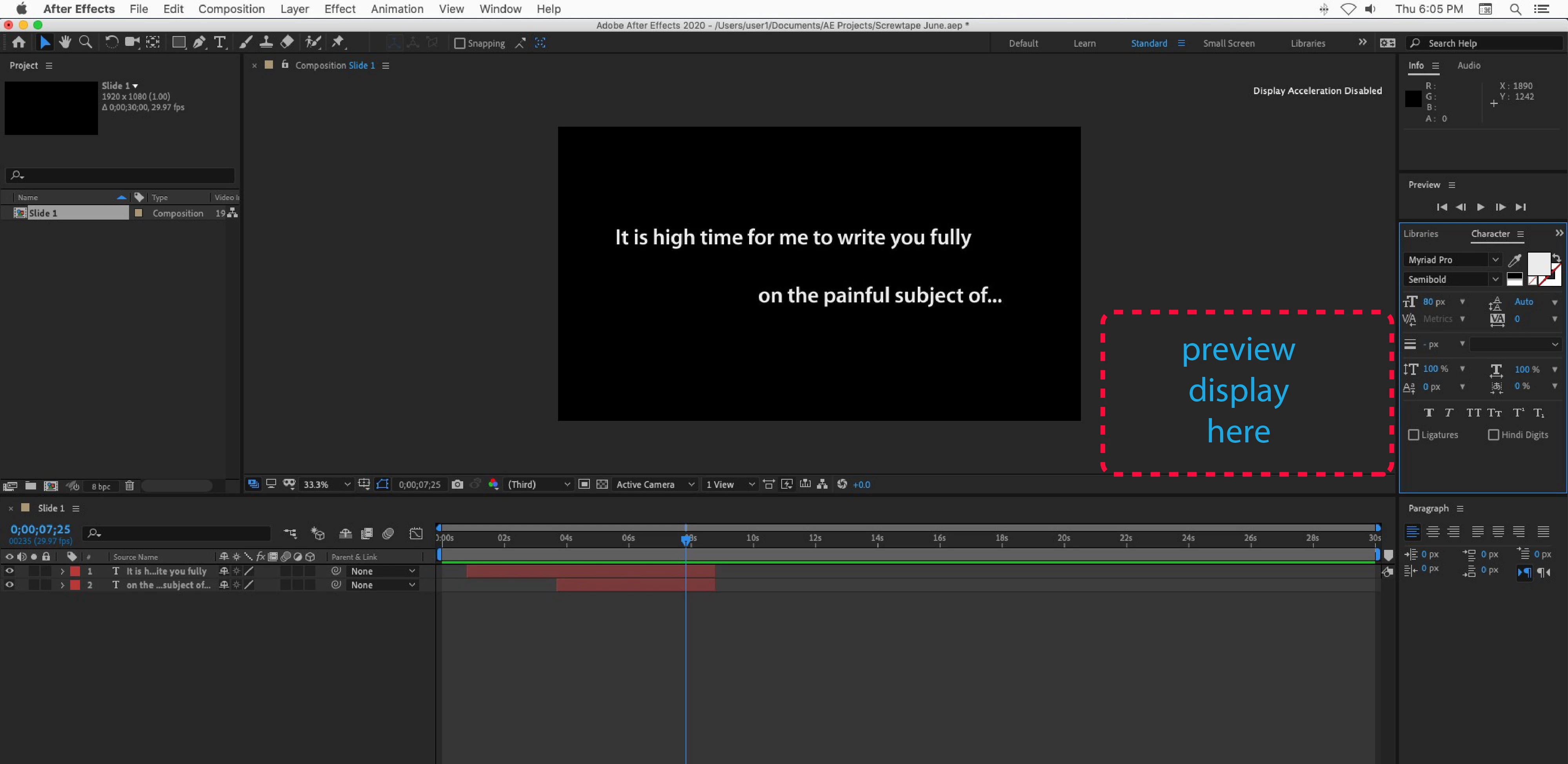 I have 2 layers. One where an intial phrase appears, then a few seconds later where more text completes the sentence.