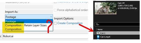Footage brings it in as “flat” no layers. Composition brings in a Photoshop or Illustrator file in with the indivdual layers the same size as the file frame size. Composition-Retain layer sizes brings in the Photoshop/Illustrator files with the layers and layer sizes which are the exact same size as what they are in those apps.