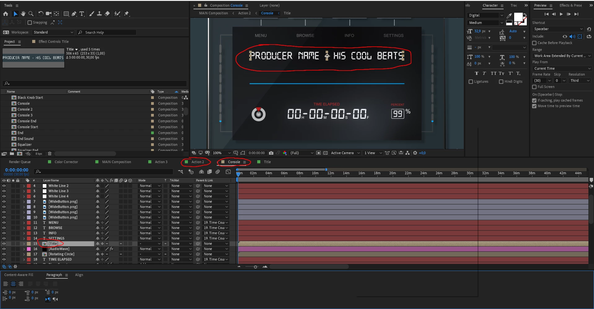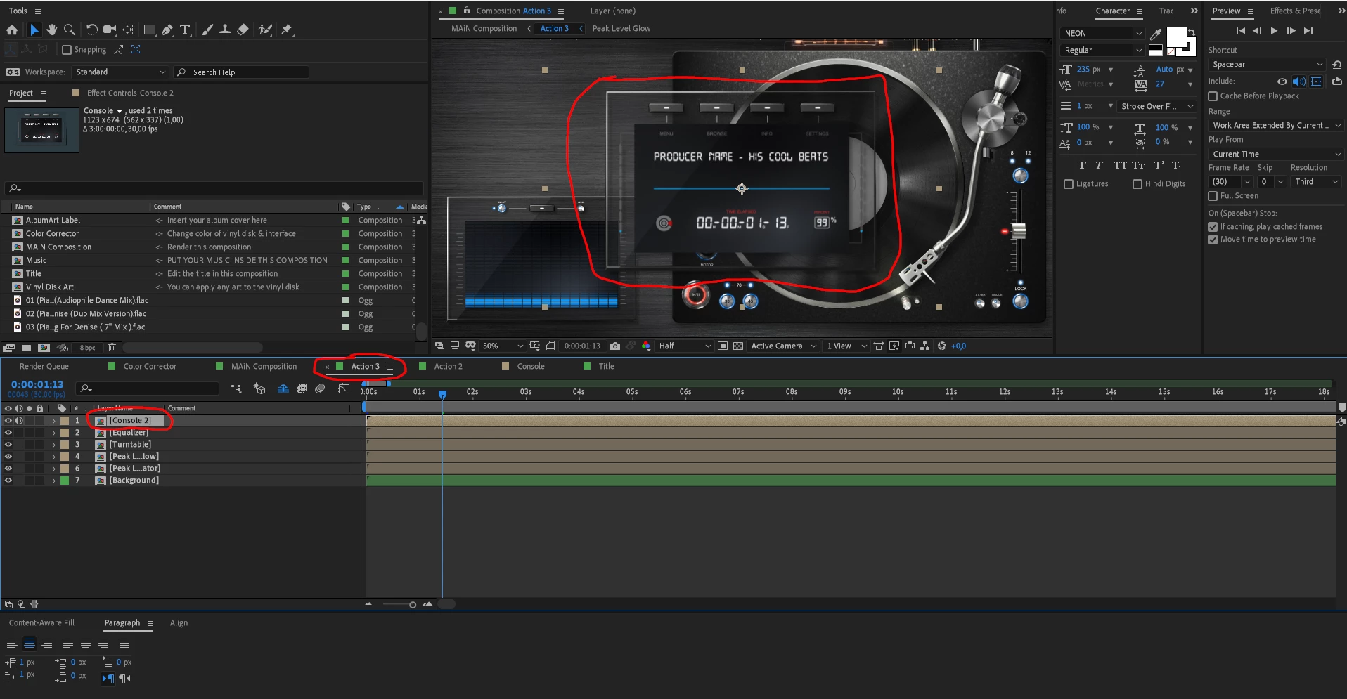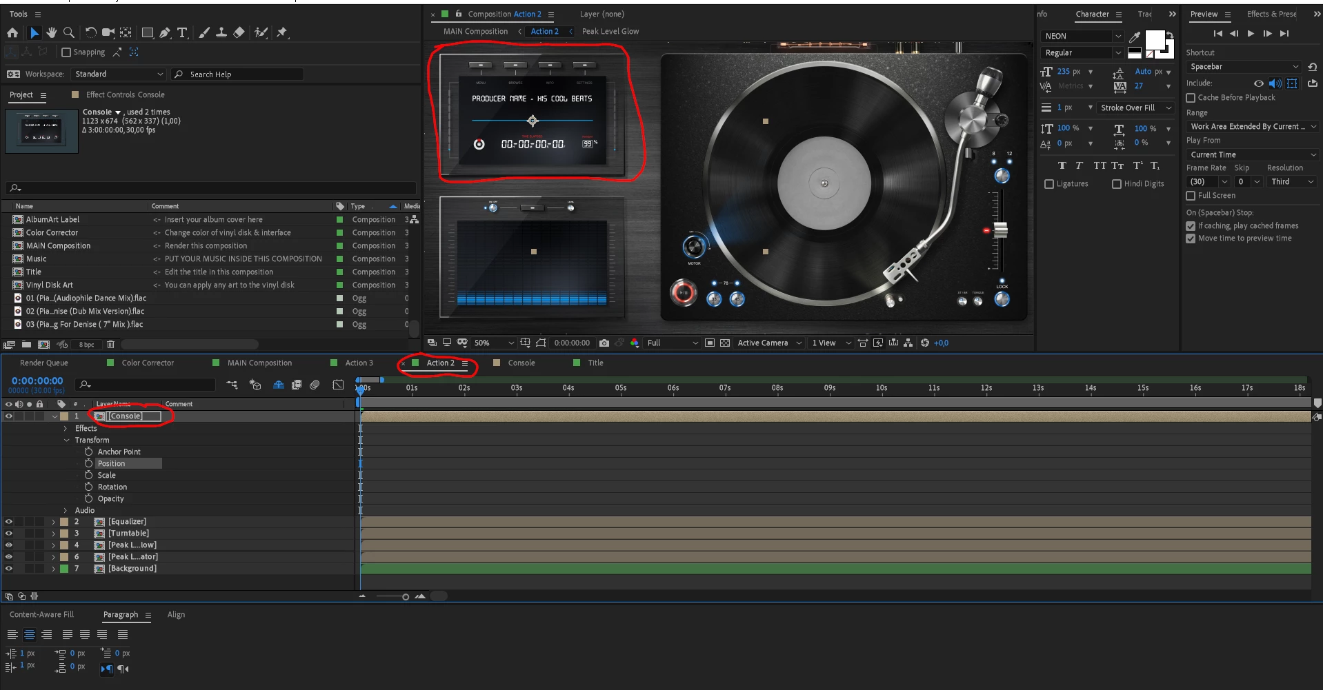 Theres is Comp called "Action". This is where the music comp is, and basically any comp needed to let the turntable work (except start and end).So the Comp Action, needs to be adjusted to the length of your Music (in my case 15 min.). All other comps inside of it are only 3 Min. Long (and shuldn't be changed in length). Inside the "Console" Comp, inside the "Action" Comp, lives the "Title" Comp used for the title on the Console (https://postimg.cc/Ln7N3bHz). This is the Title I want to be changed with every Song.
