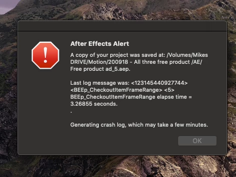 AMD Radeon Pro 5500M 4 GB Intel UHD Graphics 630 1536 MB). And it has worked great with after effects so far, although in the last couple of weeks it has crashed every time I try and work on a project, no matter how large. I get this error just after the crash...