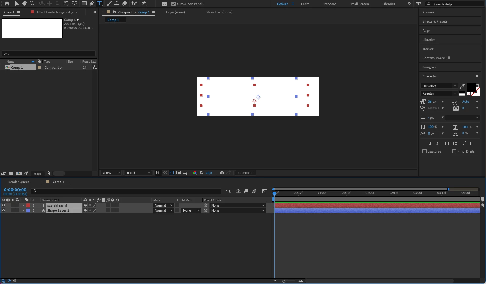 The text is on the composition, there are no keyframes set, and the font colour is black.