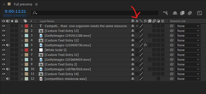 You can turn on both the switches and modes columns by clicking the first two icons in the bottom left corner of the timeline or you can right-click in the top bar and choose which columns are visible.