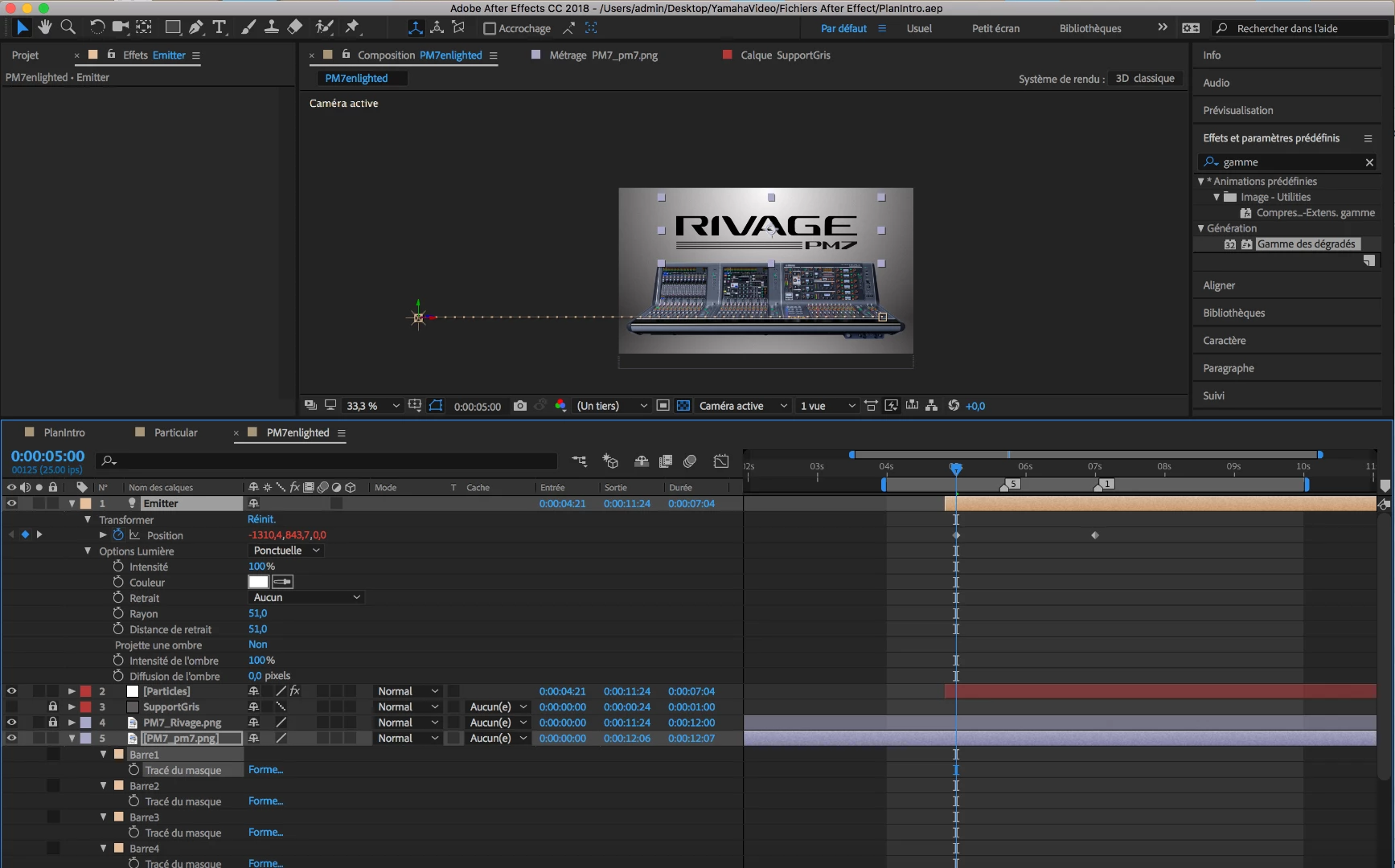 I copied the mask path (tracé du mask) and pasted it on position on the light calc called "Emitter" and it's not matching the bar that I traced with the pen tool.