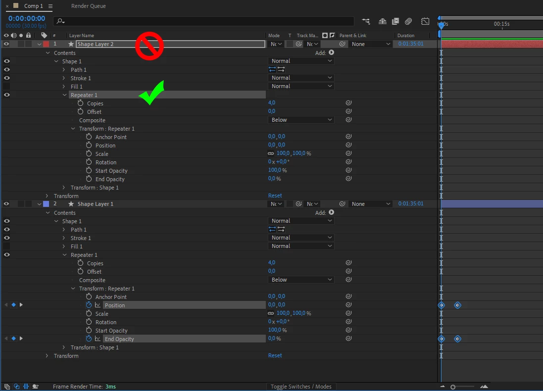 I tried to delete the reapeters of all the layers and after that i pasted the keyframes again and then the fade in effect is happening again