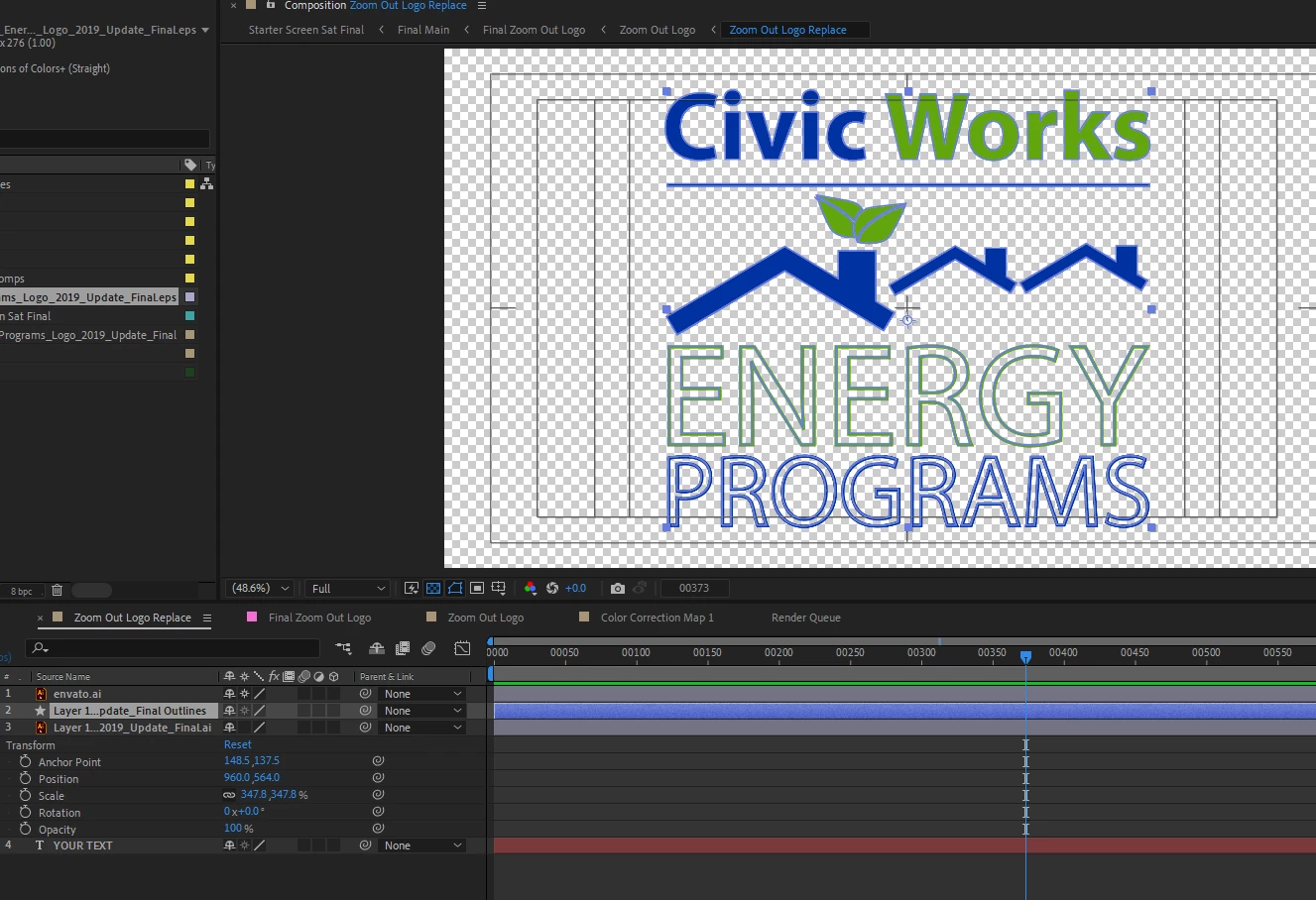 I converted the .ai file through "create shapes from vector layer" in the After Effects timeline. Once I do that, as you see the from the screen shot, the first half of the logo is fine. But the Energy Programs part only shows the outline of the two words: Energy Programs. In my .ai file, thse have a fill.