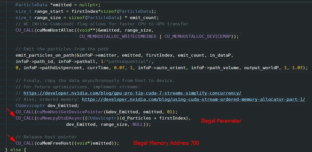 Hi everyone, I have been working on a CUDA plugin for a while now and I have to make a release build to send it to my employer for testing, in the beggining I couldn't get it to even compile but it does compile now thankfully. The issue is now I am getting CUDA errors relating mostly to memory on release, I'm not sure why, the project is based off of SDK_Invert_Procamp from the 2022 SDK so the compile flags for the kernel are mostly identical with that except the MSVC version of course for cl.exe. I am getting issues even with things like cuMemcpyDtoDAsync and cuMemFreeHost with path emission.