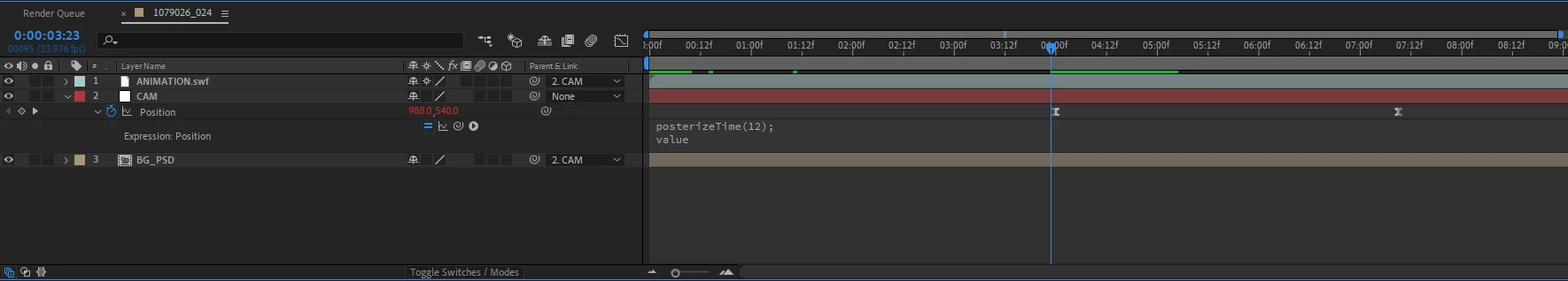 The camera move request is for moves to be on 2's, or, 12fps in a 24fps comp. The problem i'm experiencing is that the posterize time effect / expression sets the cam to move on even frames, when my animated SWF files are animated on odds. This causes strobing when my CAM and animation layers are not moving on the same frames as each other.