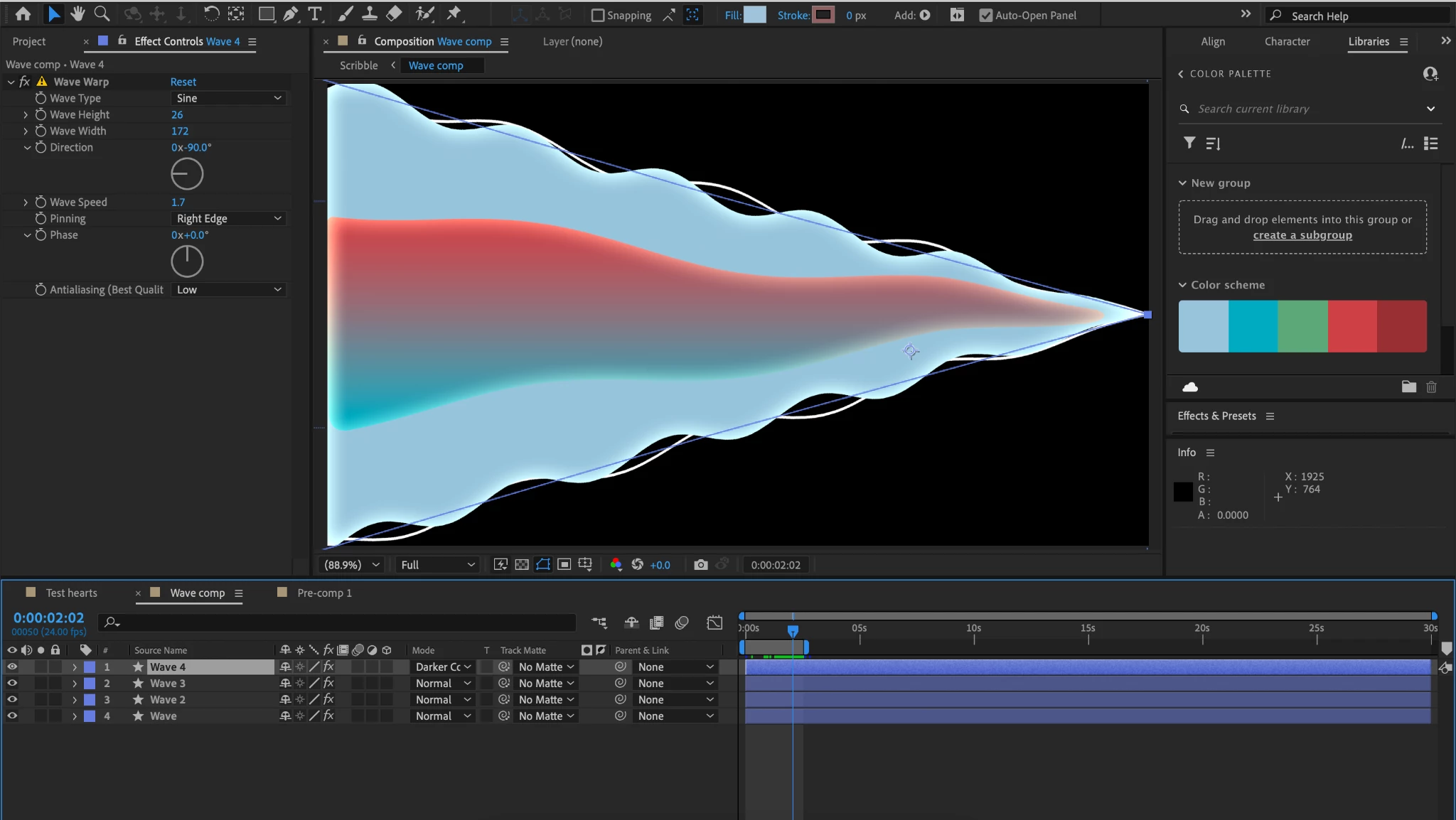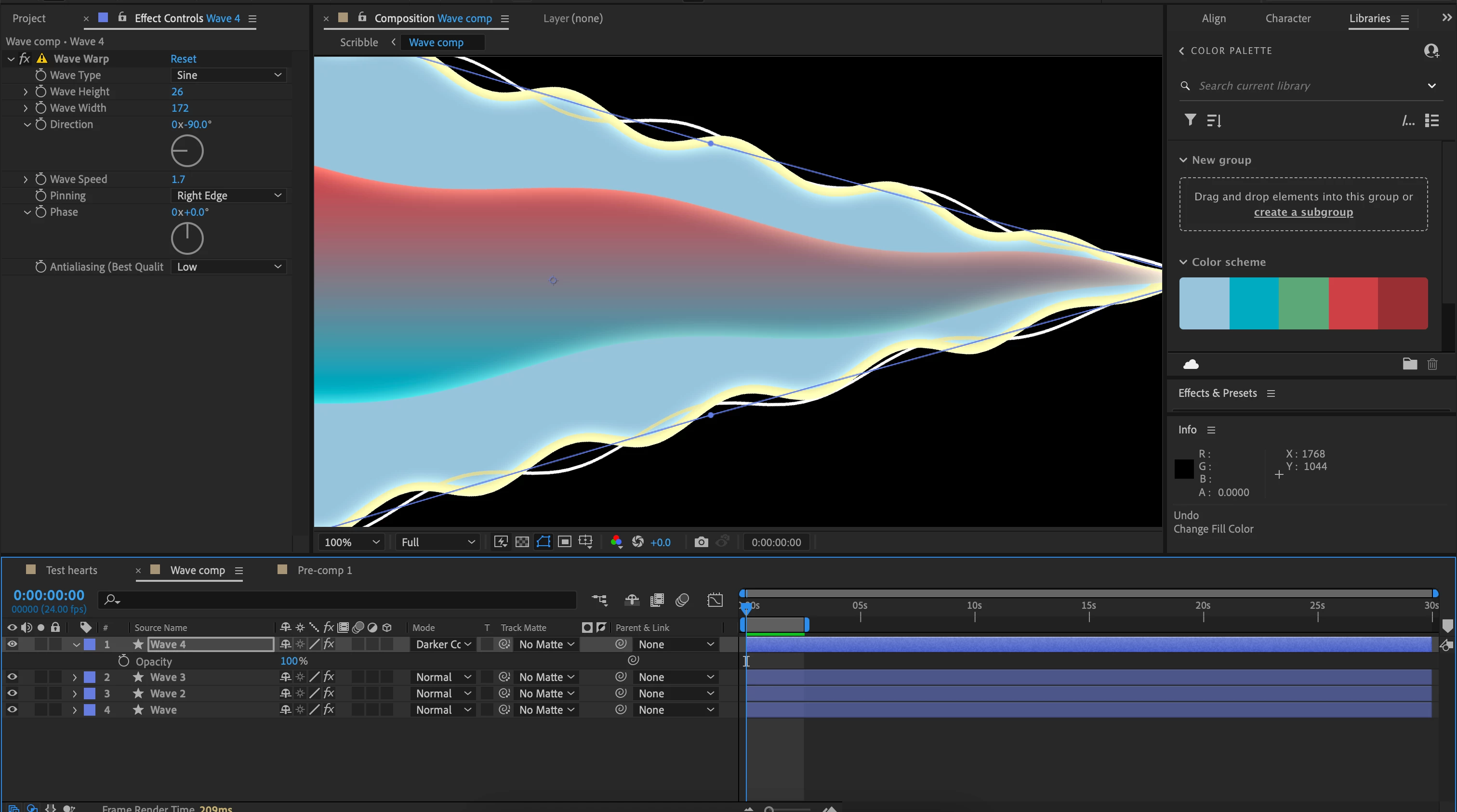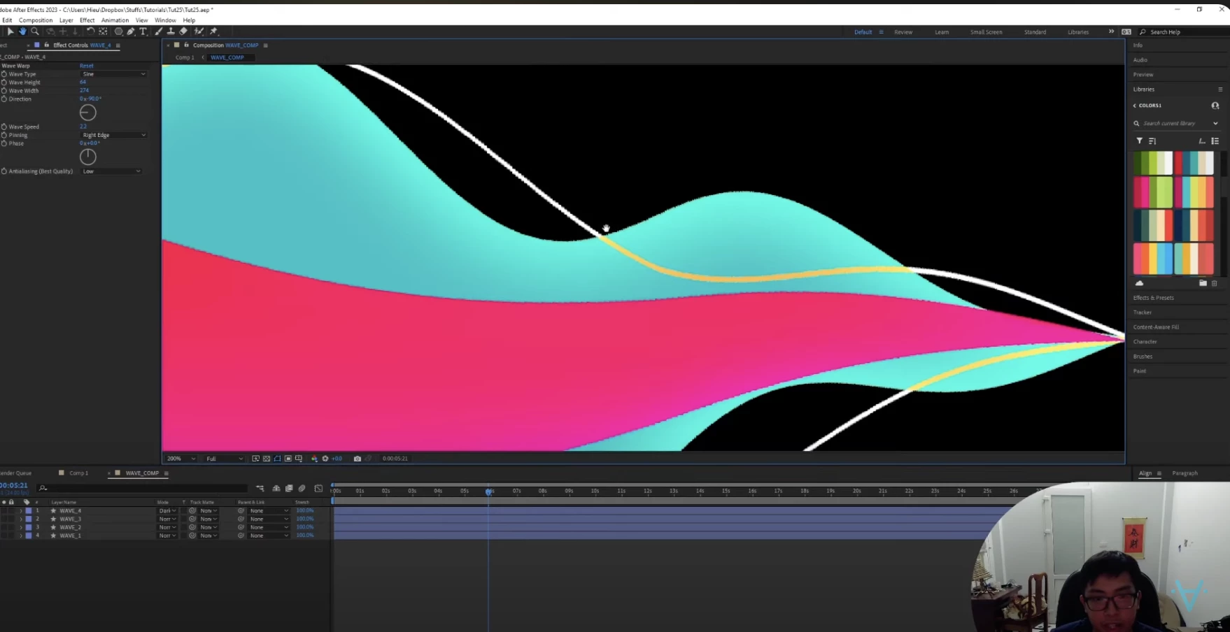Do you guys know what's happening here? I'm following a tutorial to the tee and I'm not sure why mine is different from Hieu Vu's. He duplicated the first wave layer and put it on top and changed the blending mode to darker color. I want the light blue to appear in and out on the thin white wave as its moving, but it's just covering the white wave. Interestingly, when I change wave 4 to a light yellow, it works. However, thats not the color that I want. I want the light blue to appear on the white wave, not yellow. I've tried precomposing wave 4 and the white wave layer and used the darker color blending mode but that doesn't work either. This is the tutorial that I'm following: https://youtu.be/xE4ItYkaITs?si=zJTDclkXUM9lUDVa