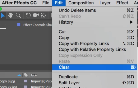 It has been a while that I have not worked with After Effects, I have been learning 3d Animation, and I am getting back to After Effects. I noticed, If you want to Delete a Layer, Video or Image, If you Right Click there Is no Clear, or Delete option. Inside the Premiere pro, you can Right Click and click on Clear. Is the only choice you have Is to click on Delete Key. Is ther any hidden Keyboard shoortcuts, or I have to create one.
