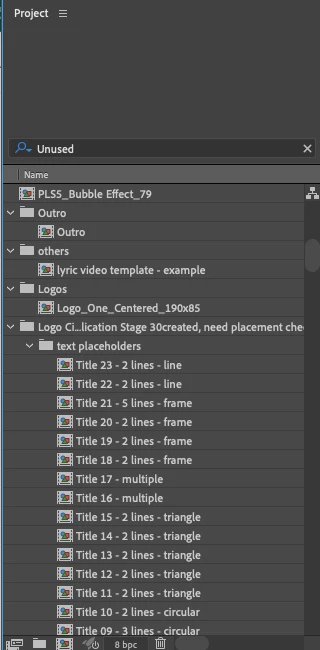 Figure 1. Project Panel after typing 'Unused'