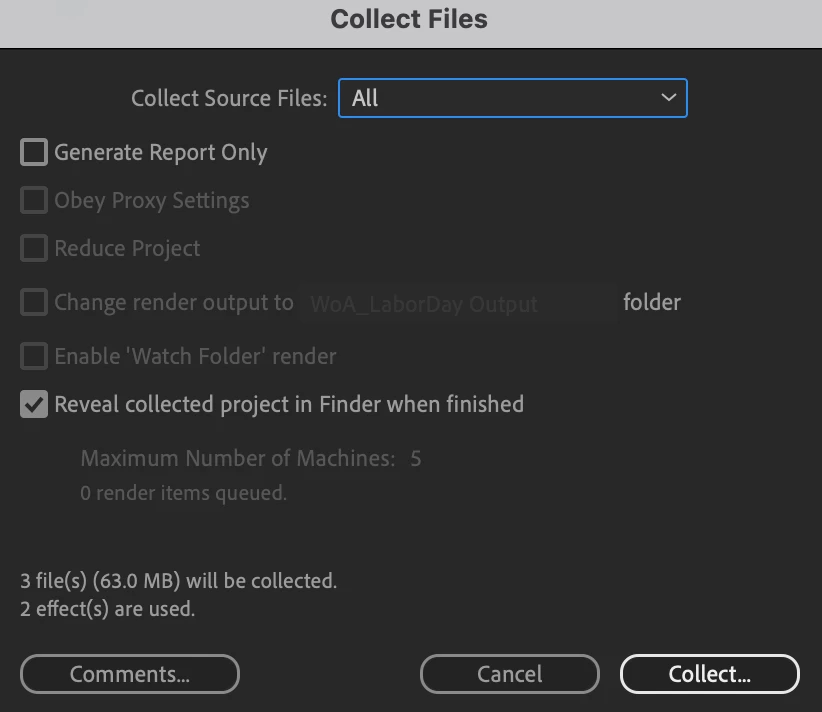 The following are the settings in the "Collect Files" dialouge box. Note the "3 file(s) (63.0 MB) will be collected."