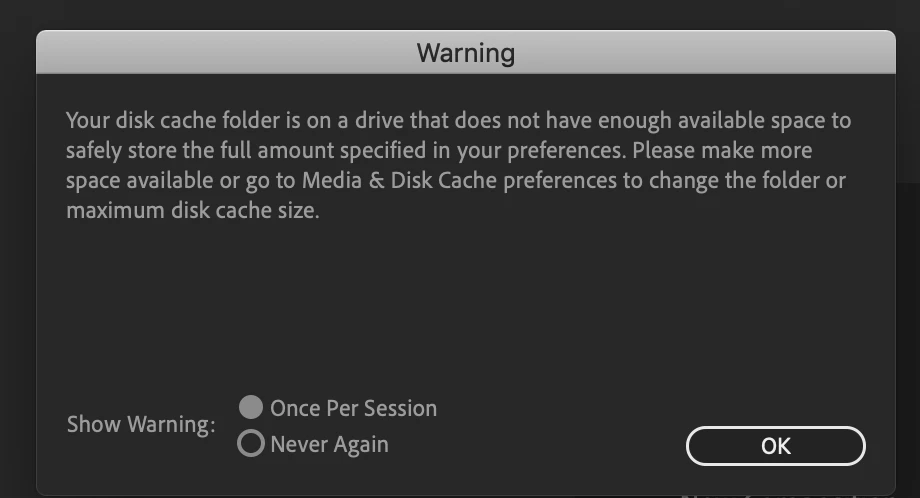 "Your disk cache folder is on a drive that does not have enough available space to safely store the full amount specified in your preferences."