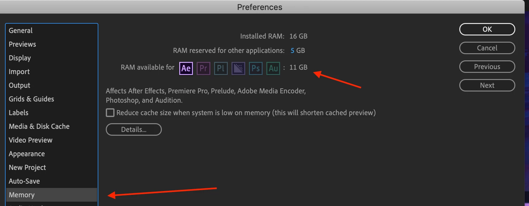 2. The second image shows you the 11GB Max RAM that I have allocated to AE (you'll find this in the Preferences -> Memory Tab)
