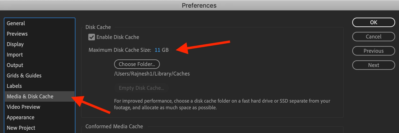 3. The third image shows you how I set the 11GB (specified in 2.) to the Max. Disk Cache Size (given in the Preferences -> Media & Disk Cache Size Tab).