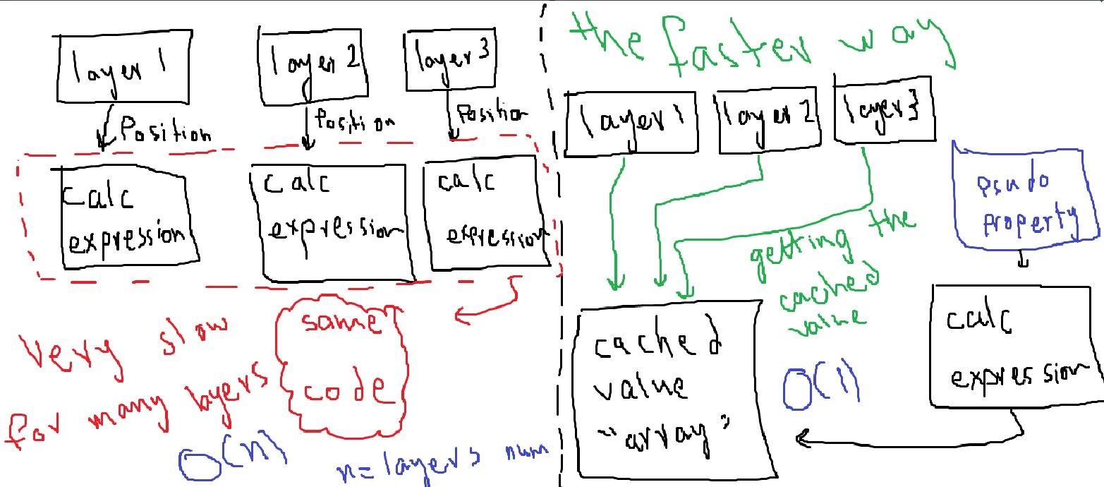 My question is can I make a sudo effect (property) calculates the repeated code, and then just get a cached value for this property to the position properties and improve the performance?