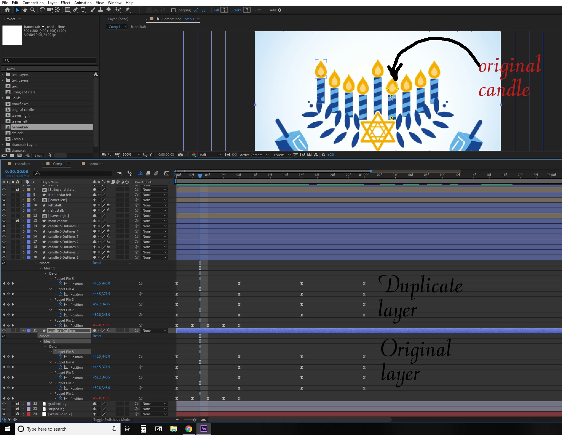I have a flickering candle with puppet pins. When I duplicate the layers, the new layers have the KF's but they do not flicker. I highlighted the pins on the original and copied to the new layers, but that does not work either. how to copy the pins from original to new layers? Thank you
