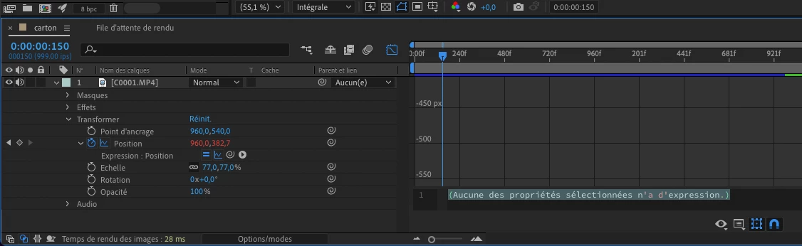 Lorsque je séléctionne mes points clés et que je rentre dans l'éditeur graphique, aucun graphique ne s'affiche et un message apparait en me disant que "Aucune des propriétés sélectionnées n'a d'expression" (Cf : photo ci dessus).