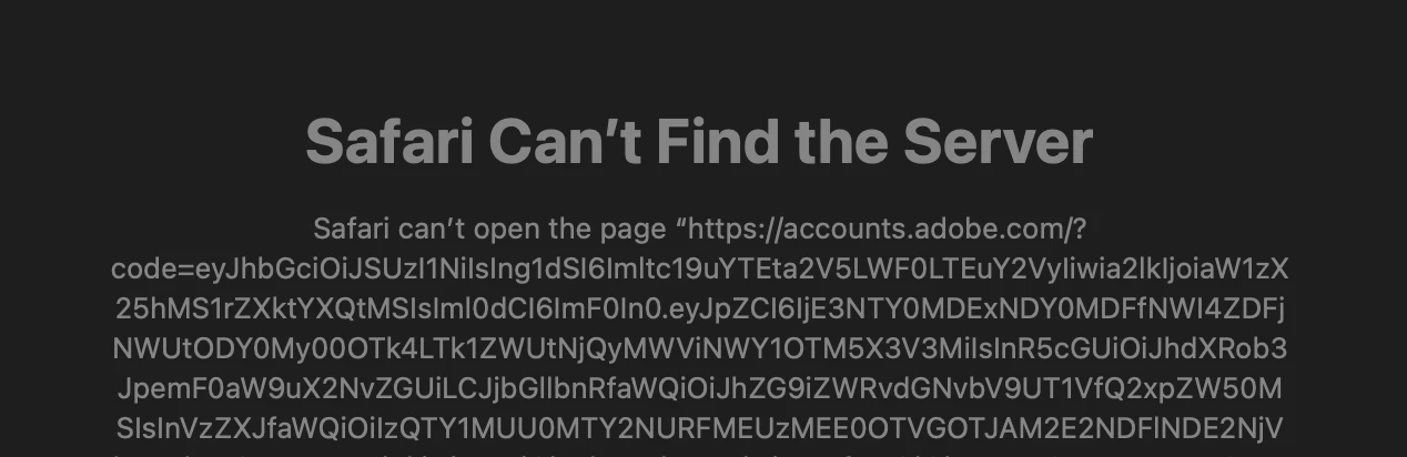Upon relaunching After Effects, the app told me I was using Adobe products on other computers and that I needed to sign out of one of them first. It also offered me a link to click to manage my account. Ok, not true, but Ok... click the link but Safari warns the server does not exist. There seems to be a typo in the address it sent me to, there is no "accounts.adobe.com"
