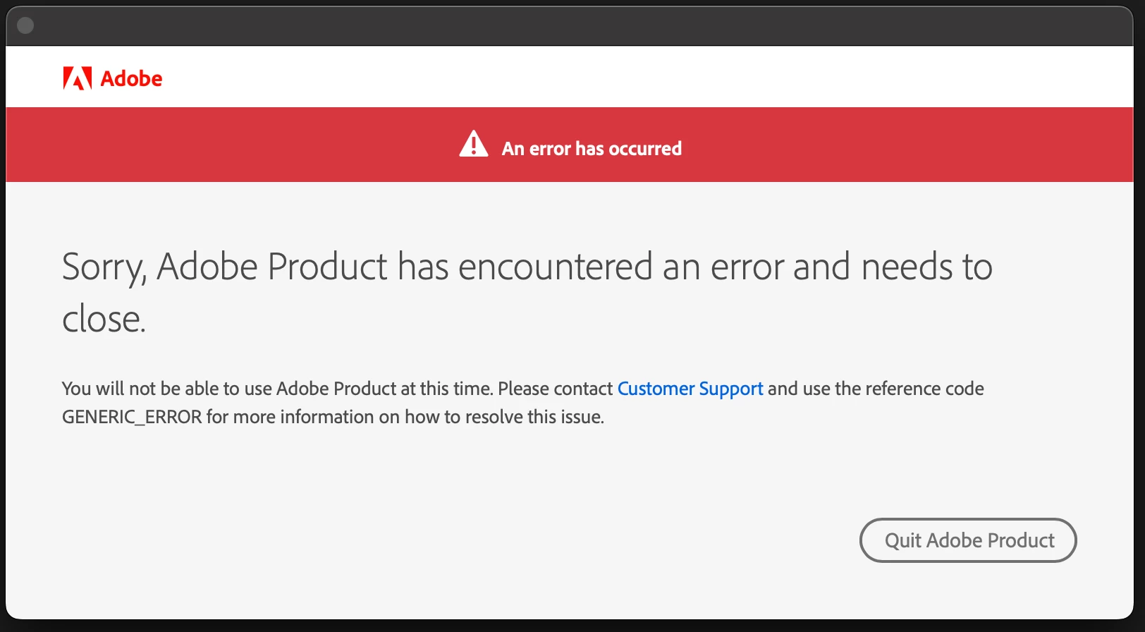 I click "Quit Adobe Product", which dismisses the error, but After Effects is now happily running. It did not quit.