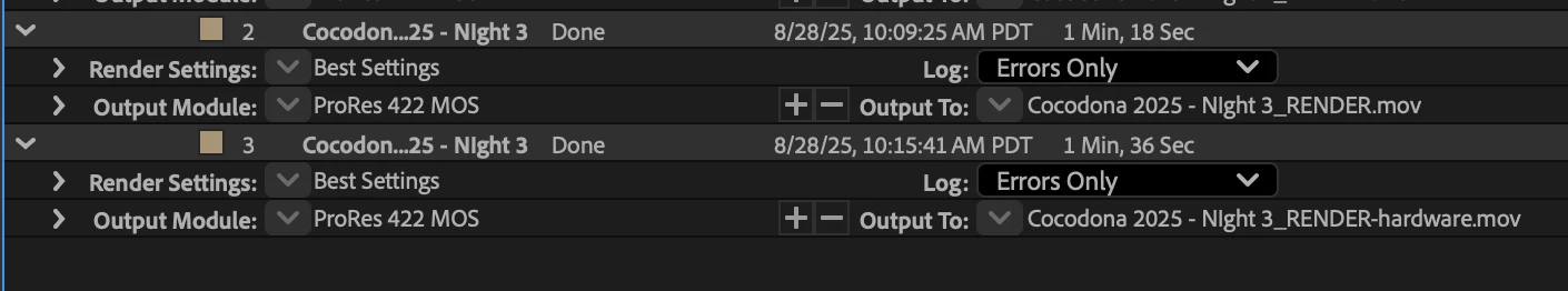 So now that I have ProRes hardware enabled encoding enabled, I re-render the comp I just-rendered before all this.