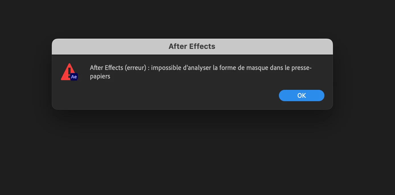 A chaque fois que j'ouvre un projet After Effect et une fois dedans dès que j'importe un élément ou essaye de faire une action, j'ai un message d'erreur "After Affects (erreur) : impossible d'analyser la forme de masque dans le presse-papiers" qui apparait. J'ai désinstallé puis réinstallé l'application et rien ne change... Auriez-vous une solution à m'apporter ?