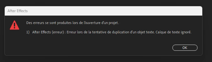 1) After Effects (erreur) : Erreur lors de la tentative de duplication d'un objet texte. Calque de Texte ignoré."