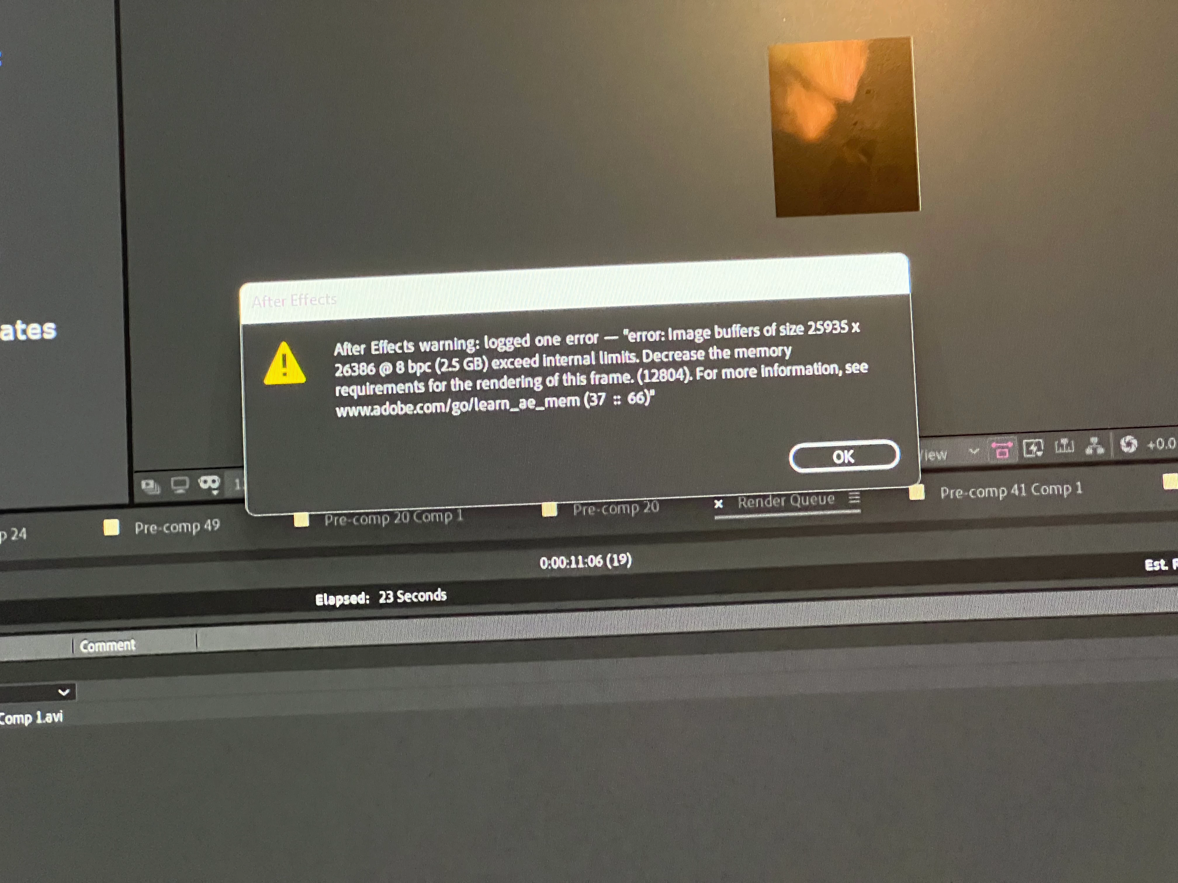 Hi, I was rendering my project when this error popped up. "error: Image buffers of size 25935 x 26386 @8 bpc (2.5 Gb) has exceeded internal limits. Decrease the memory requirements for the rendering of this frame. (12804)"