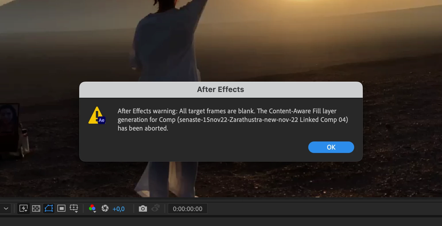 I have a file imported from a timeline in Premiere to After effect. I mask and create a path, the masked area gets black and when I hit content aware fill the error comes up with the following text; "All target frames are blank. "The Content-Aware Fill layer generation has been aborted"