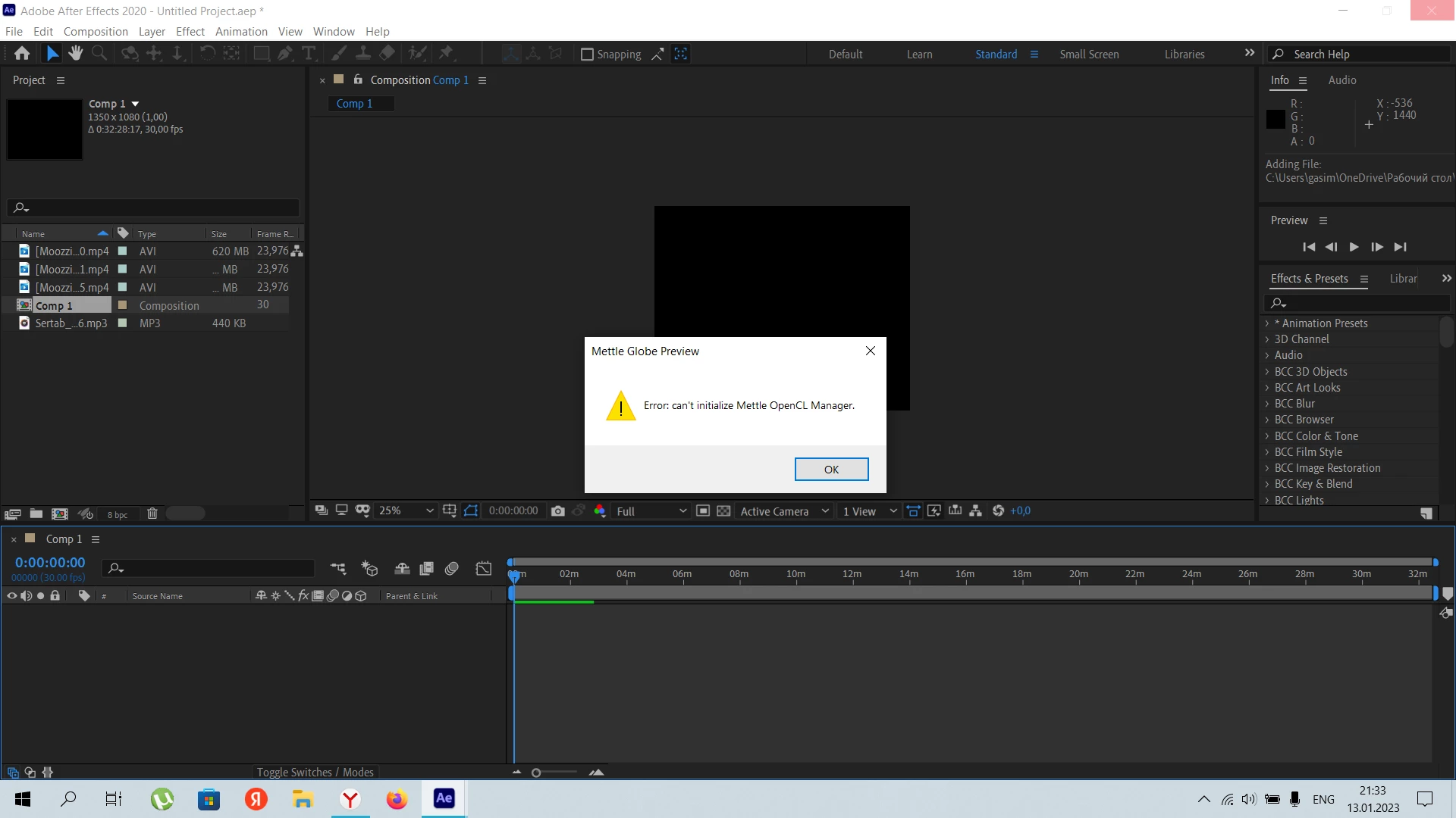 When I start doing something, this error appears, I remove it and start doing something again, it reappears and it doesn’t matter if I created a composition, it appears again, I launch the preview, it generally starts to appear every time there is a preview and I reinstall AE I don’t know what to do?