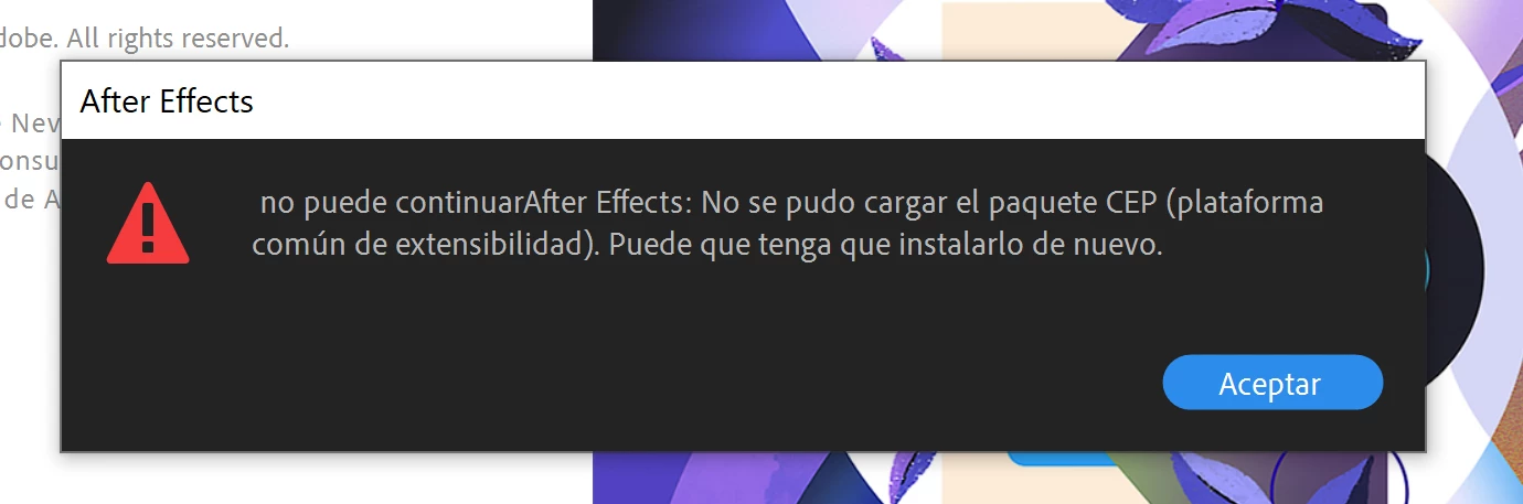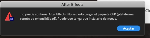 Hola a todos, tengo un problema con AE y es el siguiente: cuando ejecuto la aplicacion carga, hasta que me sale un pop up, que no pudo ejecutarse el CEP que vuelva a instalarlo, he desinstalado e instalado de nuevo la app pero insiste el error que puedo hacer?.