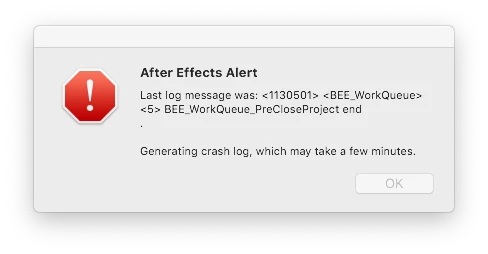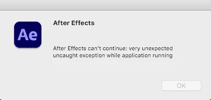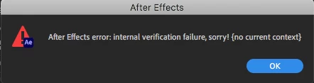 I get this After Effects error: internal verification failure, sorry! {no current context}, every time after I click on the stopwatch of one of the effects property in order to add expression to it. For example: I have Turbulent Displace effect applied on a layer and want to add expression to it's evolution property. And it just crashes in that moment. The same error happens with every other property of the effect and on every effect. This doesn't occure when I add expresions to basic layer properties like position and scale.