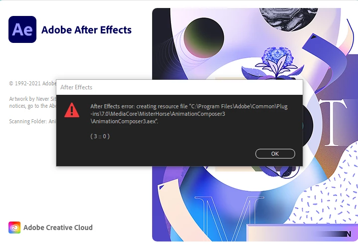 This is the error message I get when I open AE. After Effects error: creating resource file "C:\Program Files\Adobe\Common\Plug-ins\7.0\MediaCore\MisterHorse\AnimationComposer3\AnimationComposer3.aex"