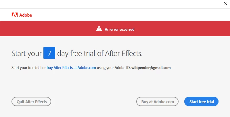 For some reason, I cannot start my free trial of After Effects. It downloads and opens successfully, but when I click "Start free trial" on the prompt that appears upon startup, it merely says "An error occurred." So far, I've tried reinstalling After Effects, restarting my computer, and clearing cache. I also followed this to no avail. I am currently using a free trial of Premiere Pro too. I've attached an screenshot of the error message.