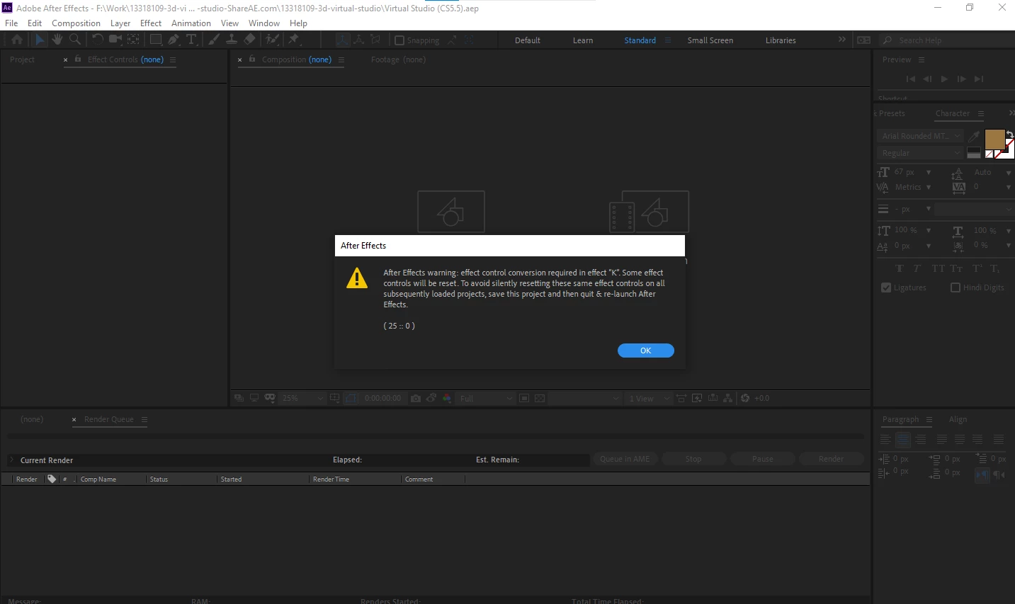 HHamza25464064o8mhParticipantForum|Forum|3 years agoJuly 31, 2022QuestionError while opening After Effects templateForum|Forum|3 years agoJuly 31, 20222 replies254 viewsI am samad from the UAE. I purchased your Template in envato marketplace. But when i open this template in after effects its say this " effect control conversion required in effect " k". Some effect Controls Will be reset. Error Code (25::0). How can i fix this Title edited by Mod. Error or problemFAQ
