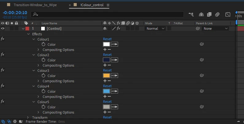 I have a project with an essential graphics comp to control colour on various comps in the project (named "!Colour_Control"). I have imported a transition comp ("Transition-Window_to_Wipe"), which also has embedded within it a "!Colour_Control" comp. I swap out the comps so there's only one "!Colour_Control" comp in the whole project, but its not updating the colours. (i.e. in the example below, the pink in the imported comp is not changing to yellow of the project comp, even when I swap the comps and delete the imported one).