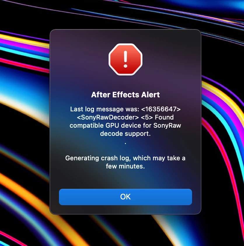 Every time I open After effects it crashes and, it says Found compatible GPU device for SonyRaw decode support. I click OK but nothing happens.