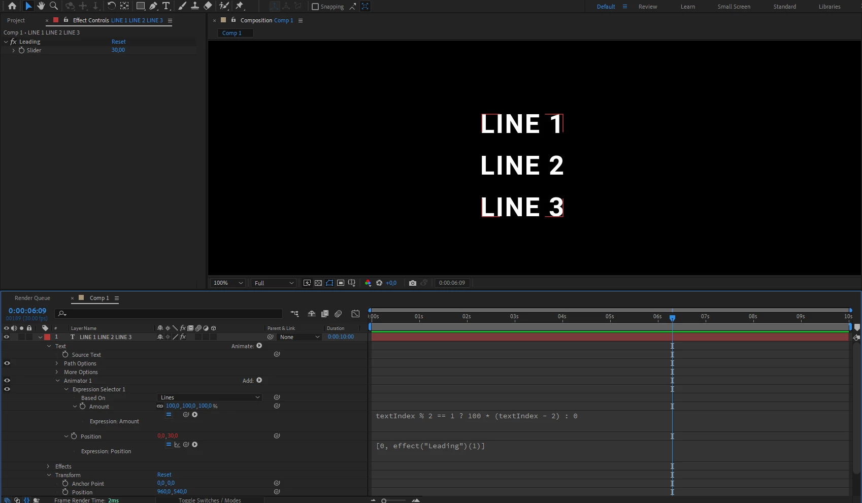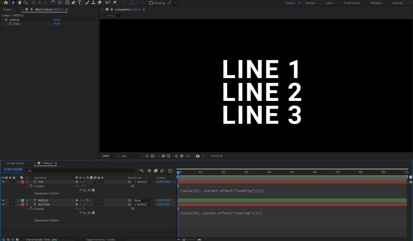 I'm trying to do a simple expansion of 3 lines of text but make the middle line the base so that it doesn't move, and the top line and bottom line expand in their respective directions but I can't seem to figure out how to use line spacing or leading to make the lines expand from anything other than the top line of the text.