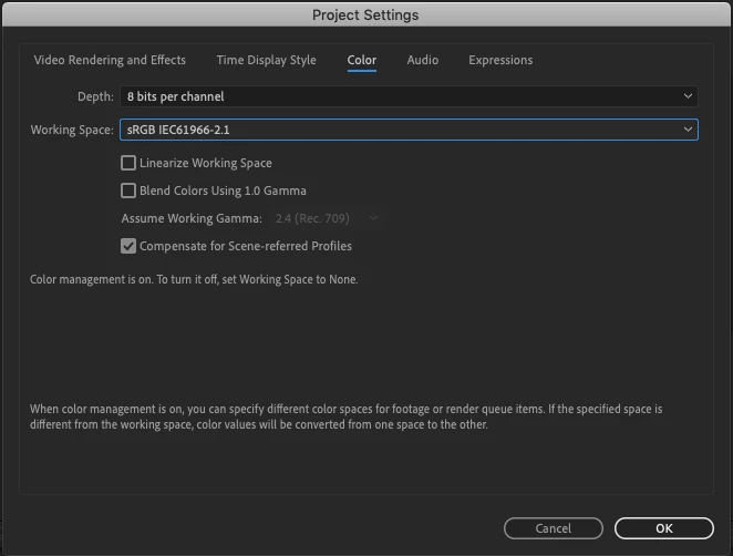 En illustrator y en After Effects los colores con los que trabajo son correctos, no me los cambia cuando importo los archivos de AI a AE. El problema viene al exportar, que es cuando me los cambia. He probado en exportar en h.264 y ProRes 244 y me da el mismo resultado. Estoy trabajando con este ajuste de color, que es con el que he trabajado siempre.