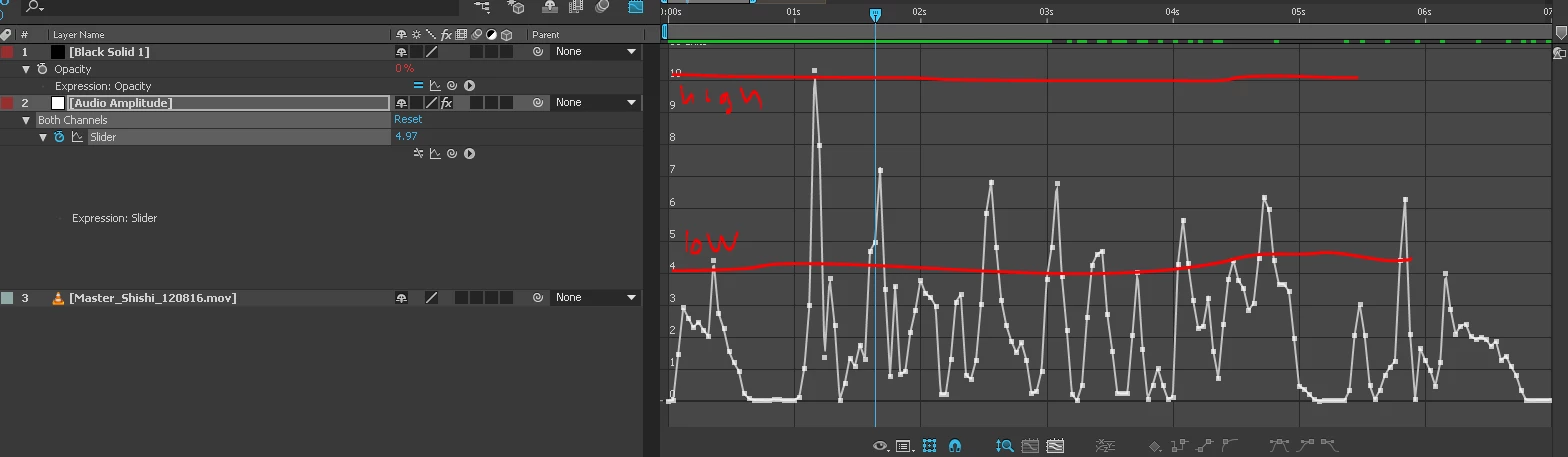 usando la amplitud de audio(la que se genera convirtiendo el audio en fotogramas clave), lo que quiero hacer es que de acuerdo a la variación de la amplitud de audio quiero que la opacidad vaya desde 0 a 100, pero lo que hace es variar entre 0 y 100. yo quiero que solo se mueva de esos dos puntos 0 y 100. para que cuando el audio suene la opacidad vaya al 100 y cuando no haya nada o casi nada desaparezca.